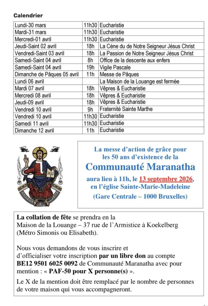 Horaire de la Communauté avril 2026 . Bonnes fêtes pascales à vous tous.tes ! . . Pour plus d’information, contactez : *protected email* a-la-une